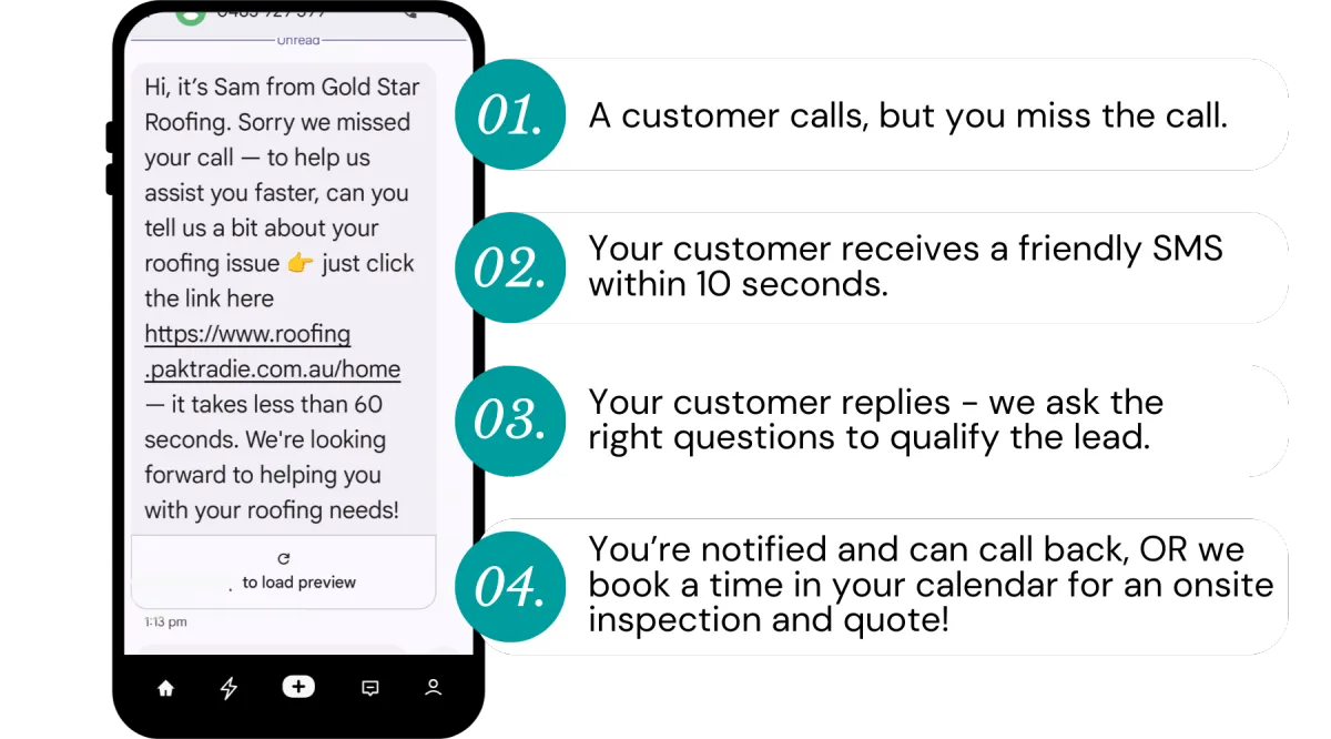 A quick demo of our missed call text-back system will show you exactly how many jobs are slipping through the cracks while you’re up on the roof. If you're not following up instantly, chances are your competition is stealing the work that should’ve been yours!